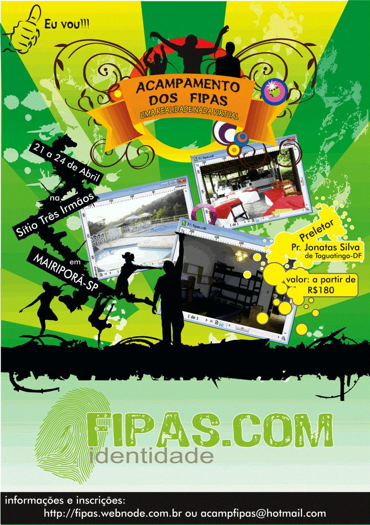 Um Acampamento pensado e planejado para os fipa's do nosso Brasil aproveitarem ao máximo cada minutinho de comunhão com os demais, além de descobrirmos o que a Palavra de Deus diz especialmente para nós. Você vai ficar de fora dessa? Conheça as nossas idéias aqui pelo site e não perca tempo, faça logo a sua inscrição! As vagas são limitadas.